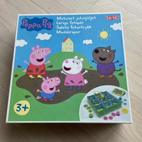 Peppa Pig Mud Party brætspil til børn fra 3 år. Spillet indeholder spilleplader med Peppa Pig-figurer, brikker med mudderklatter, markører (en lilla markør mangler) og øvrige papdele som vist på billederne. Spillet har brugstegn, brugt af små børn, men stadig masser af god leg i.