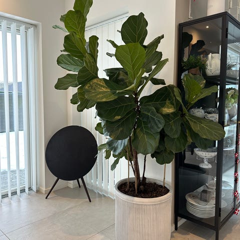 Ficus, der er vokset sig meget høj samt tilhørende krukke sælges. Krukken er turkisgrøn og er 50 cm høj
