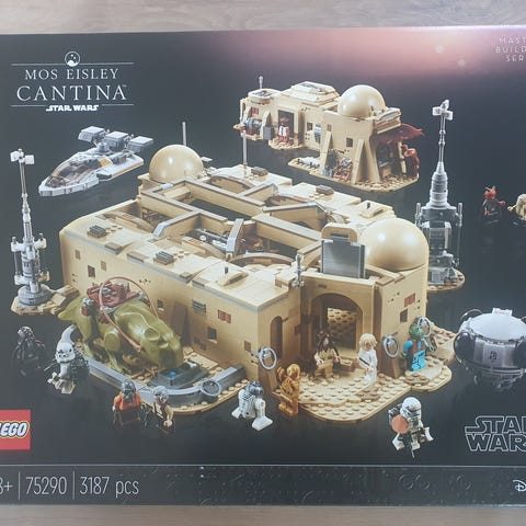 LEGO Star Wars Mos Eisley Cantina byggesæt. Sættet forestiller den kendte cantina-scene fra Star Wars-universet med detaljeret bygning, køretøjer og flere minifigurer. Velegnet som samlersæt og til modelbygning for Star Wars-interesserede.