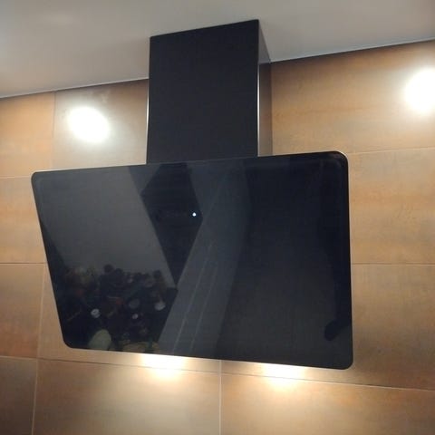 Emhætte til vægmontering med front i sort glas. Modellen har indbygget belysning og metalfedtfilter, som kan tages ud for rengøring. Egnet til montering over komfur i køkken og kan tilsluttes aftræk eller eventuelt kulfilter, afhængigt af installation. Passer til moderne køkkener med glatte, lige fronter og sort/hvide elementer.