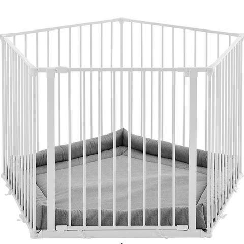 BabyDan Square kravlegård i hvid metal med mål ca. 105 x 72 x 71 cm. Rektangulær kravlegård med tremmer hele vejen rundt og en ekstra bred åbning i den ene side for lettere adgang. Kan anvendes som sikkerhedsafskærmning omkring f.eks. brændeovn, når den kombineres med ekstra sektioner efter producentens anvisninger. Kravlegården kan foldes sammen, så den fylder mindre ved opbevaring. Velegnet som sikkert legeområde til spædbørn og småbørn indendørs.