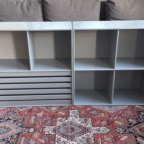 To stk. Montana reoler med glaslåger og hylder sælges. Farven er perlemor. Hver reol måler 70x70x30 cm.