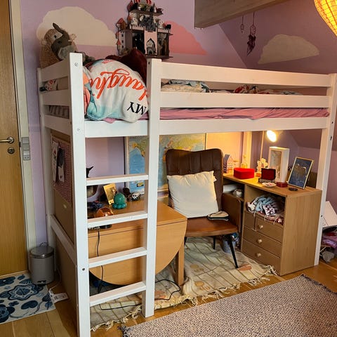 Hoppekids ECO Dream højseng i hvid. Sengen er en halvhøj model med integreret stige og sengehest hele vejen rundt. Sengen er i fuld funktionel stand, men med lidt mærker på kanten (se billede 3) Derfor den gode pris. Under sengen er der god plads til opbevaring eller leg. Velegnet som juniorseng/børneseng. Nyere pæn madras (IKEA UNDERLIG, nypris 499) kan medfølge for 200 kr. Fra røg- og dyrefrit hjem. Sengen bliver skilt ad i dag (08.02.2026) så den er nem at hente :-)
