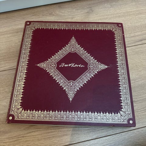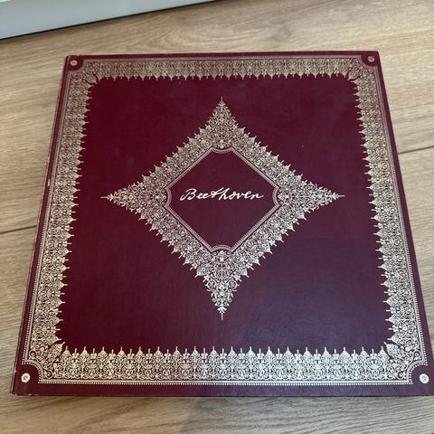 Beethoven LP pladesæt i samleboks. Sættet indeholder vinylplader med værker af Ludwig van Beethoven, leveret i en dekorativ rød boks med guldtryk. Medfølgende hæfter med information og noder om komponisten og hans symfonier. Velegnet til samlere af klassisk musik og til afspilning på pladespiller med standard LP-format.
