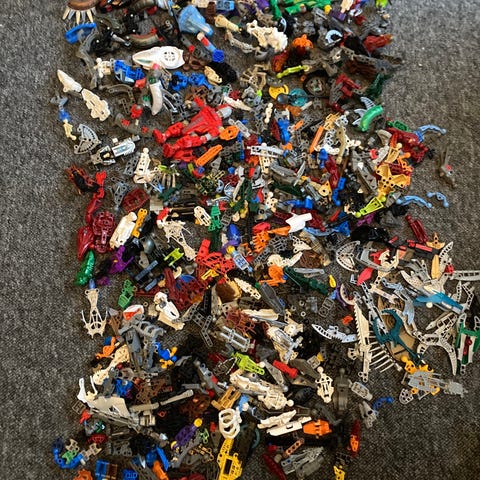 LEGO Bionicle klodser og dele i blandet parti fra min ikke længere eksisterende Bricklink butik. Delene ligger sorteret i plastposer og består af forskellige Bionicle-elementer som figurdele, våben, masker og tekniske klodser. Egnet til at samle eller genskabe Bionicle-figurer, udbygge eksisterende samlinger eller bruge som reservedele til LEGO Bionicle-projekter.