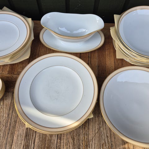 Bing & Grøndahl Beethoven stel i hvidt porcelæn med rød kant og guldfarvet bort. Stellet omfatter forskellige tallerkener, skåle, fade samt kopper med tilhørende underkopper.
