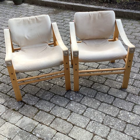 Lænestol med stel i lyst træ, ryg+armlæn i kernelæder og cognacfarvet læderhynde. Åben, let konstruktion med brede armlæn og synlige samlinger. Velegnet som loungestol i stue eller opholdsrum. Pris er pr stk. Begge sælges for 5.500