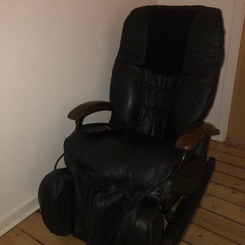 Massagestol sælges. Fungerer som den skal. Læderet er slidt, men uden huller.