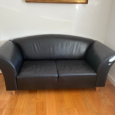 2-personers sofa i brun læder med træstel i sæbebehandlet bøg.. Sofaen har polstrede sæde- og ryghynder samt åbne træarmlæn og ryg. Velegnet til stue eller mindre opholdsrum, hvor der ønskes en kompakt siddeplads til to personer.
