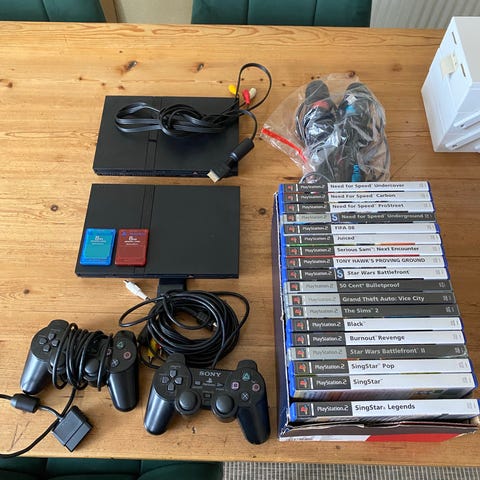 Sony Playstation 2 konsol med tilbehør og spil.