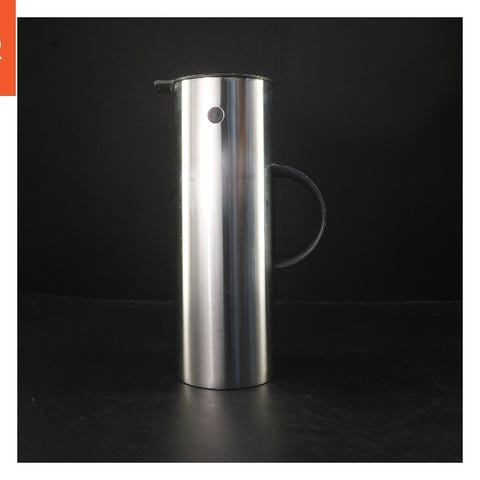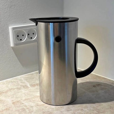 Stelton termokande i cylindrisk design. Kanden er udført i rustfrit stål med sort plastikhank og sort låg. Velegnet til servering af varme eller kolde drikke i køkken eller spisestue. Enkel og funktionel udformning, der passer ind i mange typer køkkenudstyr. Stort set aldrig brugt.