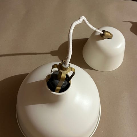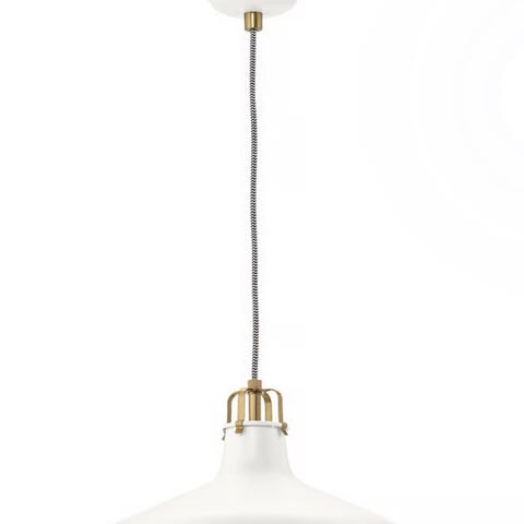 IKEA Ranarp loftlampe i hvid metal. Klassisk skærm med inderside og yderside i hvid, detaljer i messingfarvet metal og tekstilbetrukket ledning. Lampen er egnet som belysning over bord, i køkken eller i andre rum, hvor der ønskes direkte nedadrettet lys. Bruger standard pære (se sokkeltype på lampen eller original specifikation fra IKEA).