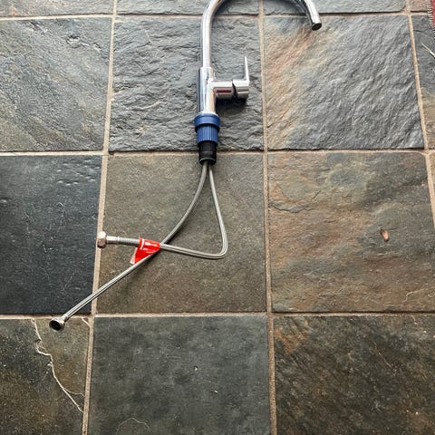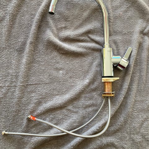 Køkkenarmatur i krom med etgrebsbetjening. Armaturet leveres med tilslutningsslanger og monteringsbeslag som vist på billederne. Velegnet til montering i køkkenvask eller bordplade med hul til enkeltarmatur.