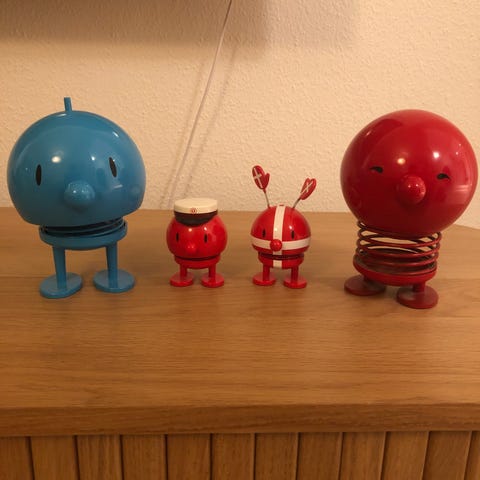 Hoptimist figur i blå. Klassisk fjederfigur med rundt hoved, næse og små fødder. Velegnet som dekoration på hylde, skrivebord eller i børneværelse.