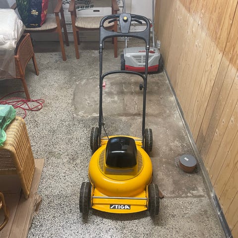 Elektrisk plæneklipper i gul og grå farve. Plæneklipperen har fire hjul og sammenklappeligt håndtag for nem opbevaring. Egnet til klipning af mindre til mellemstore græsarealer i haven.