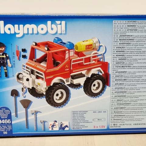 Indeholder: Brandbil med stige, lys, lyd og fungerende vandkanon samt tilbehør og brandmænd.