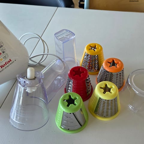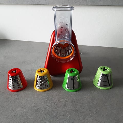 Elektrisk rivejern/grøntsagssnitter med udskiftelige tromleindsatser til rivning af grøntsager og ost. De medfølgende plastdele fungerer som beskyttelse og føring af råvarerne. Vejledning mv. medfølger, hvis ønsket.