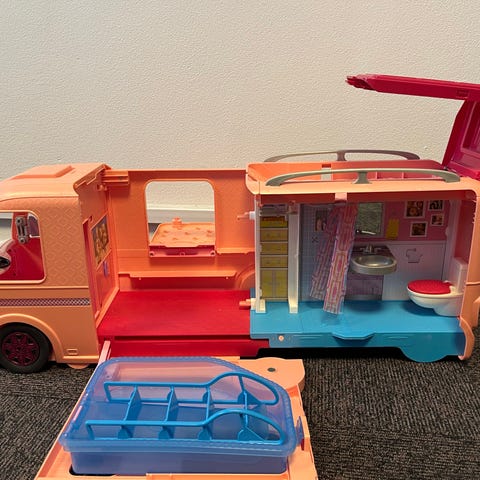 Du kan åbne den forreste del af camperen for at finde en pickup-bil med plads til fire. Kig under bagsædet på bilen for at finde en båd inkl fiskestænger og fisk! Når du vil slå lejr, kan du åbne sidepanelerne for at omdanne autocamperen til et camping-legesæt med plads til fire dukker, der kan spise, sove, lege og grille pølser og skumfiduser. Når den ene side foldes ud, kommer der en pool til syne, mens den anden side omdannes til et udendørs køkkenområde. Mellem de to findes et dagligstueområde. Og så kan bagsiden åbnes, hvor badeværelset med pop up-brusebad, toilet og toiletbord findes.