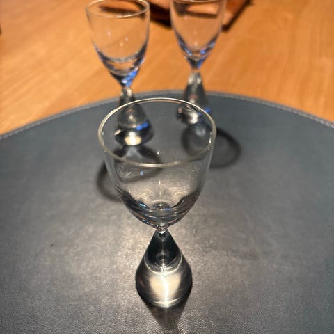 12 stk. snapseglas fra glaspuster Lene Højlund. De måler 9,5 til 10 cm. i højde, har forskellige farver i fod. Fremstår i hel og flot stand.