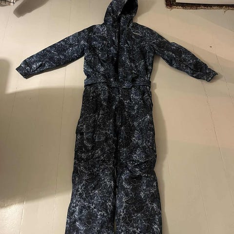 Peak Performance skidragt bestående af jakke og bukser. Sættet er i blå med hvide og orange detaljer. Jakken har hætte, gennemgående lynlås og foret inderside, men foret er ikke meget tykt. Bukserne er i matchende blå farve