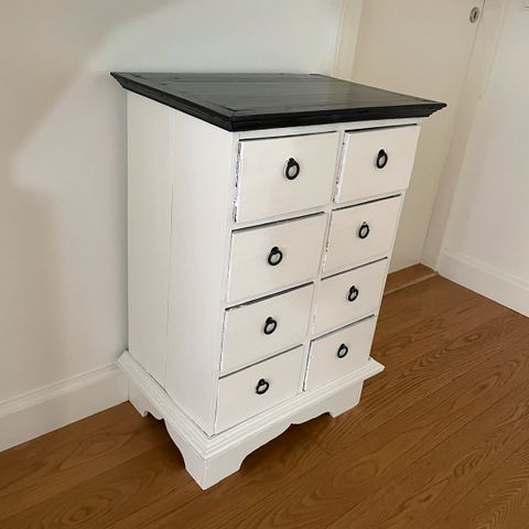 Stor smuk kommode. Malet hvid. Nøglen i nederste skuffe sidder fast.
