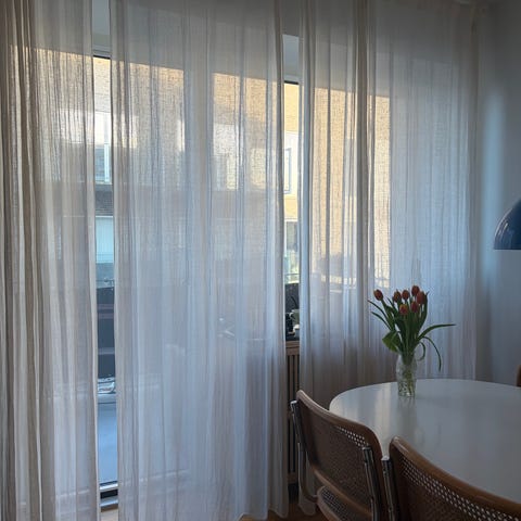 H&M Home gardin i grå meleret farve. Gardinet har et vævet teksturlook og er forsynet med rynkebånd for ophæng på gardinskinne eller med kroge. Bagsiden fremstår glat og lysere grå. Velegnet til stue, soveværelse eller andre rum, hvor der ønskes afskærmning og dæmpning af lys.