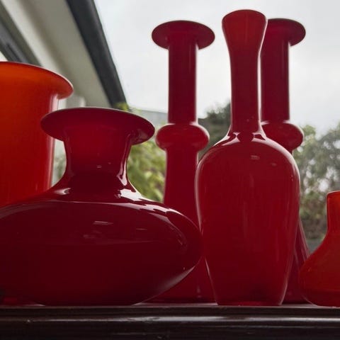 Seks vintage glasvaser i røde og orange farver. Alle intakte. Holmegaard og andet.