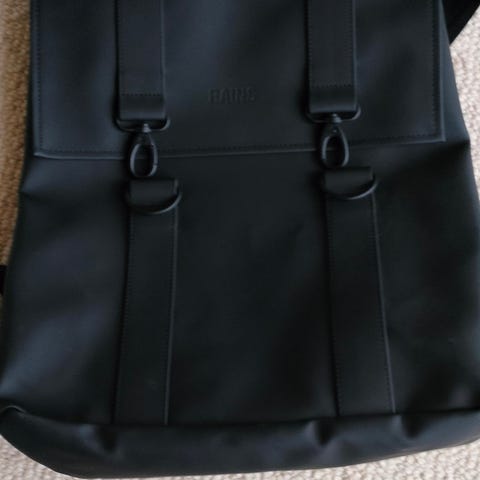Rains rygsæk i god stand, måler cirka 40x40 cm. Ingen huller, men lidt pletter – mest på bagsiden. Lavet i plast, så vandafvisende og praktisk til hverdag.