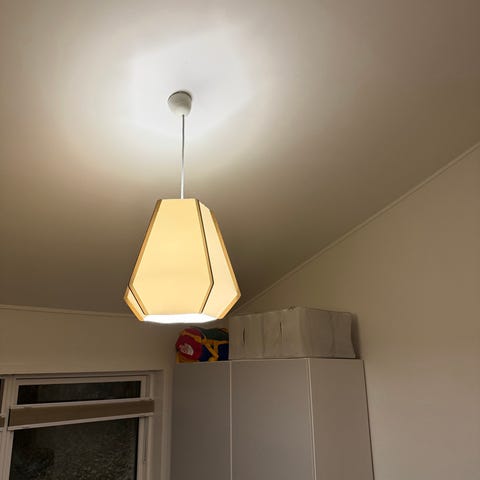Flot pendel i ask og stenpapir, som giver et blødt og varmt lys. Højde 56 cm, diameter 58,8 cm. Meget fin stand. Med fatning, kort stofledning.