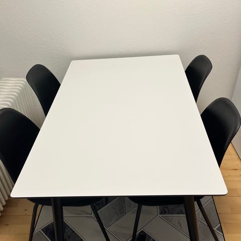 Spisebord med rektangulær bordplade og fire matchende stole i hvid. Bordet har lige ben og en glat overflade, egnet som spisebord eller arbejdsbord. Stolene har formstøbt sæde og ryglæn samt slanke ben. Sættet passer til køkken, spiseområde eller mindre kontorhjørne.