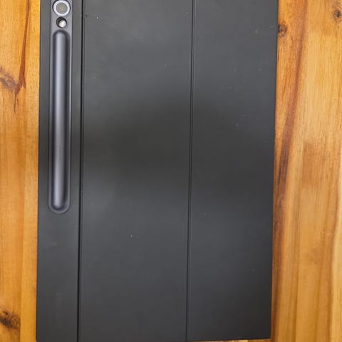 Samsung Galaxy Tab S8 ultra tablet med 8 GB hukommelse. Enheden har touchskærm og understøtter brug af stylus-pen, som ses på billederne. Tabletten vises med et beskyttende cover med frugt-motivet , som kan bruges til at stille tabletten op i forskellige vinkler. Velegnet til almindelige tablet-opgaver som internetbrug, streaming og apps