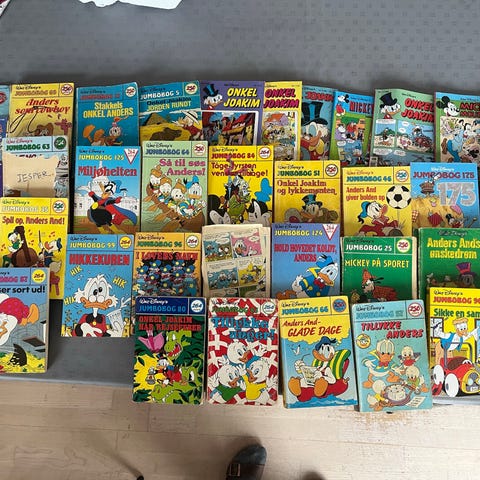 Disney Anders And og Onkel Joakim tegneserier lot. Samling af blandede Anders And-blade, Jumbo-bøger og andre Disney-tegneserier med motiver fra Andeby-universet. Forskellige numre og årgange, både hæfter og bøger, med farvede omslag. Velegnet til læsning, samling eller som ekstra eksemplarer til eksisterende samling. Plastkassen følger med.