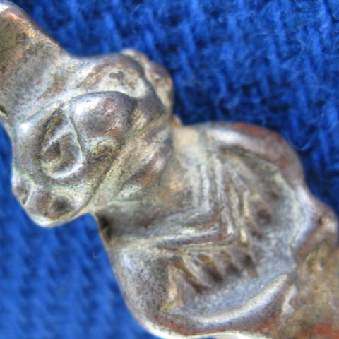 Den har haft et hårdt liv med en del skader. Der er afslag på kammen og på siden. Næbbet har været knækket af og limet på igen. Underkæbe har afslag på begge sider.
