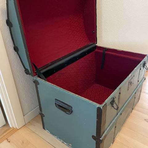 Vintage kiste i træ og lærred i beige og sort. Kisten har buet låg, metalbeslag og låsebeslag på fronten samt bærehåndtag i siderne. Egnet til opbevaring af tøj, tekstiler eller andre genstande og kan også anvendes som dekorativ møbel- eller indretningsdetalje i stue, soveværelse eller entré.