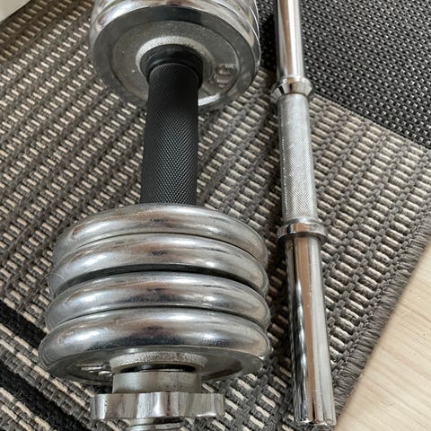 Håndvægtsæt bestående af to korte vægtstænger med gevind og tilhørende metal-vægtskiver. Sættet leveres i en plastkuffert med formstøbt indlæg til opbevaring. Vægtskiverne er runde med hul til montering på stængerne og fastgøres med stjerneformede lukkemøtrikker. Egnet til styrketræning derhjemme, hvor vægtene kan kombineres efter behov for forskellige øvelser til arme, skuldre og overkrop.