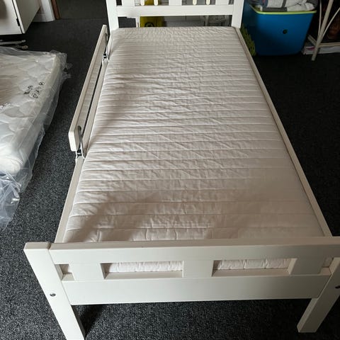 IKEA juniorseng i træ med lamelbund. Sengen har sengehest på den ene side og gavle med lodrette sprosser. Under sengen er der opbevaringsskuffer, som kan bruges til legetøj, sengetøj eller tøj. Lækker tilkøbt madras medfølger.