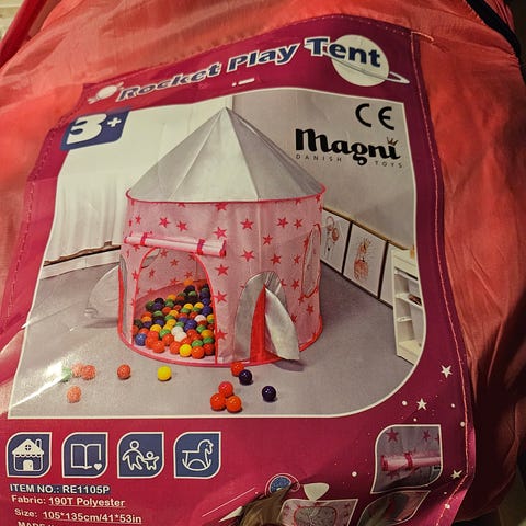 Legetelt til børn med farvede 100 kugler. Teltet har trekantet form med åbning foran med store, flerfarvede prikker. Egnet som indendørs legetelt til mindre børn, f.eks. til leg, læsehjørne eller boldbassin. Kan typisk foldes sammen for nem opbevaring og flytning.