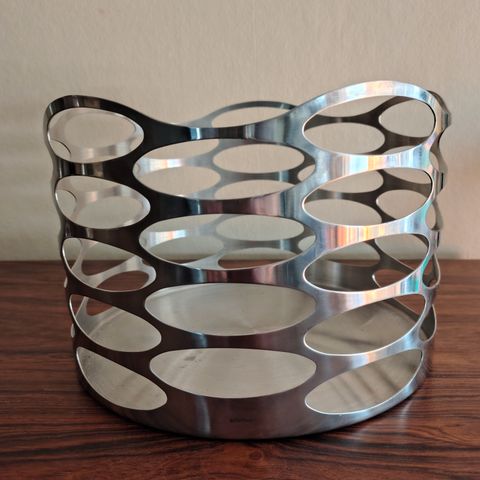 Stelton brødkurv i rustfrit stål. Rund skål med udskårne ovale åbninger langs kanten og glat bund. Velegnet til servering eller opbevaring af fx frugt, brød eller andre tørre fødevarer på bordet eller i køkkenet. Neutral, børstet stålfinish, der passer ind i mange typer indretning. Diameter 23 cm.