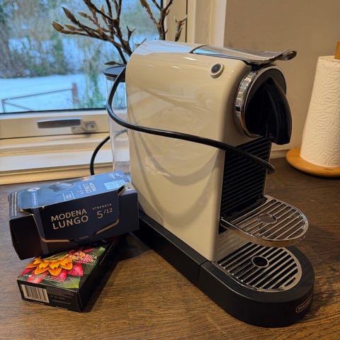 Nespresso kapsel kaffemaskine i hvid med sort drypbakke og håndtag. Maskinen anvender Nespresso-kapsler og har aftagelig vandtank bagtil. Egnet til brygning af enkeltkopper espresso eller kaffe derhjemme eller på kontoret.