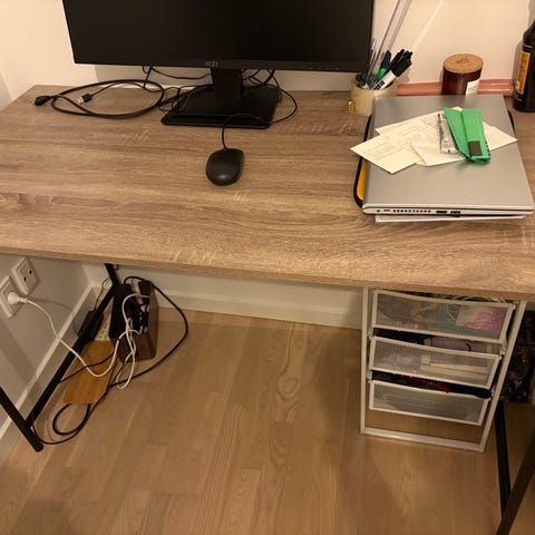 Beige top og ben. Ben kan drejes af, hvorfor let at transportere.