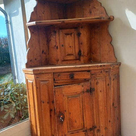 Smukt, enkelt afsyret hjørneskab i fyrretræ. Hjørneskabet er blevet afsyret midt i 1970'erne, som det var på mode dengang. Skabet er højt og smalt, så det tager ikke så meget plads ud i rummet. God plads i skabet. Hjørneskabet giver karakter til rummet uden at det dominerer for meget. Går fint sammen med mere moderne møbler. Endelig kan det jo også males, hvis man synes.