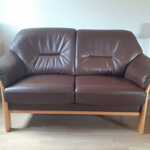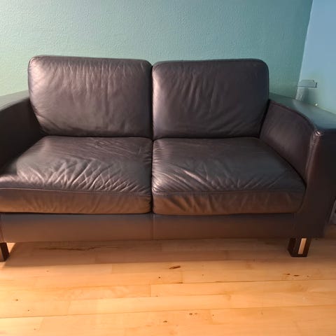 Sofa i sort læder fint velholdt i egnet læderpleje fra leverandør.