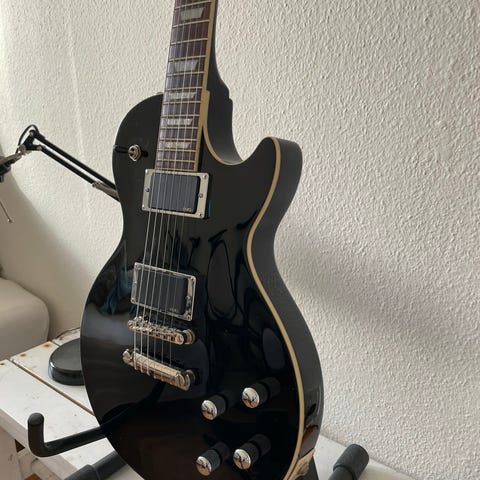 Sælger denne smukke guitar. Der er tale om Epiphone Standard, som er den fine afdeling af Epiphone. Træet, materialer, finish og spilbarhed er i top på disse modeller. Den er bygget om med en masse nye dele. Der sidder nye NYXL 10-46 strenge på, nye tone og volume knapper, crome huse til pickupperne, og så er den blevet justeret. En stor opgradering er pickupperne. Det er aktive pickupper, så de er nemme at styre, støjer minimalt og så er der masser af output. Samme opsætning bruges af Metallica, Zakk Wylde etc.