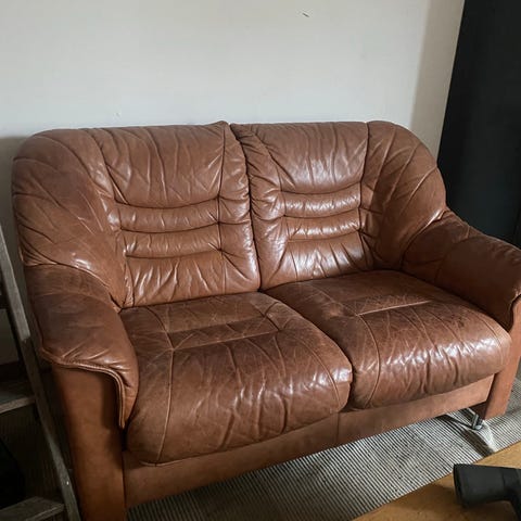 Brunt læder. Stolen har haft en skade på fødderne som er lavet med rustfri beslag. Derudover er der lidt kradsemærker fra en kat på armlænet af den lille sofa.