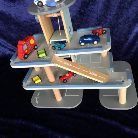 Fisher-Price parkeringshus legetøjssæt med 3 etager, rampe og elevator. Sættet parkeringshuset, samt en bus, flere små biler og tilhørende figurer.