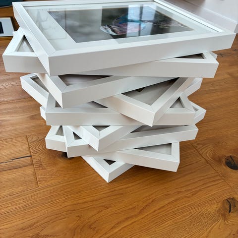 IKEA billedrammer i sæt af tre stk. Rammene er hvide og rektangulære i forskellige størrelser, velegnet til fotos eller plakater i mindre format. De kan hænges på væg eller stilles på en hylde alt efter behov. Motiverne i rammerne kan udskiftes efter ønske.