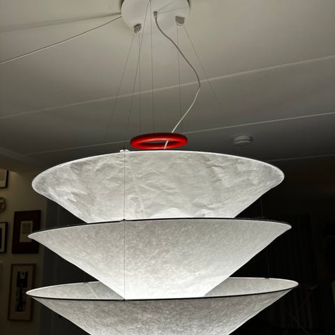 Flos Ingo Maurer loftlampe med dekorative pærer. Lampen er udformet med flere lyskilder monteret på snoede metalarme. Hver pære er udstyret med små vingelignende skærme, som giver et skulpturelt udtryk. Loftbeslaget har indbygget ledningsudgang til fast montering i loft. Lampen er egnet som belysning over bord eller i opholdsrum, hvor der ønskes en markant og dekorativ lyskilde. Nypris er 20.000, sælges for 5.000 pga løs el-forbindelse (kan fikses af elektriker).