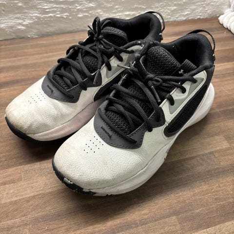 Nike basketballsko i størrelse 44 se størrelsesmakat på billede. Skoene er i hvid med mørkegrønne detaljer og sål. Overdelen er i tekstil og syntetisk materiale med snørelukning. Indersålen har basketballmotiv, og sålen er mønstret for greb på underlaget. Velegnet til basketball og anden indendørs eller hverdagsbrug. Brugt en gang