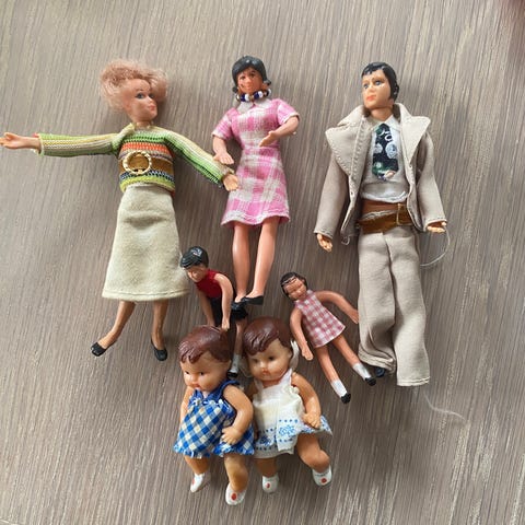Lundby hundefigur med hvalpe og tilbehør. Sættet består af en større hund, to hvalpe samt små tilbehørsdele, der kan bruges i et dukkehusmiljø. Figurerne er i miniaturestørrelse, velegnet til Lundby dukkehuse og lignende dukkehusleg. Materialet fremstår som hård plast eller lignende, egnet til leg og dekoration i dukkehus.sælges plus evt porto