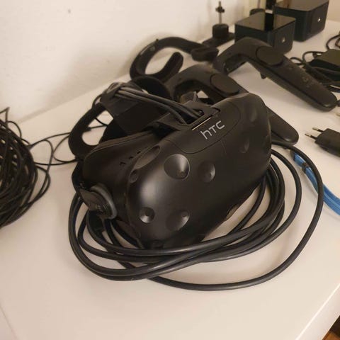 HTC Vive VR-headset med tilhørende håndcontrollere og basestationer.